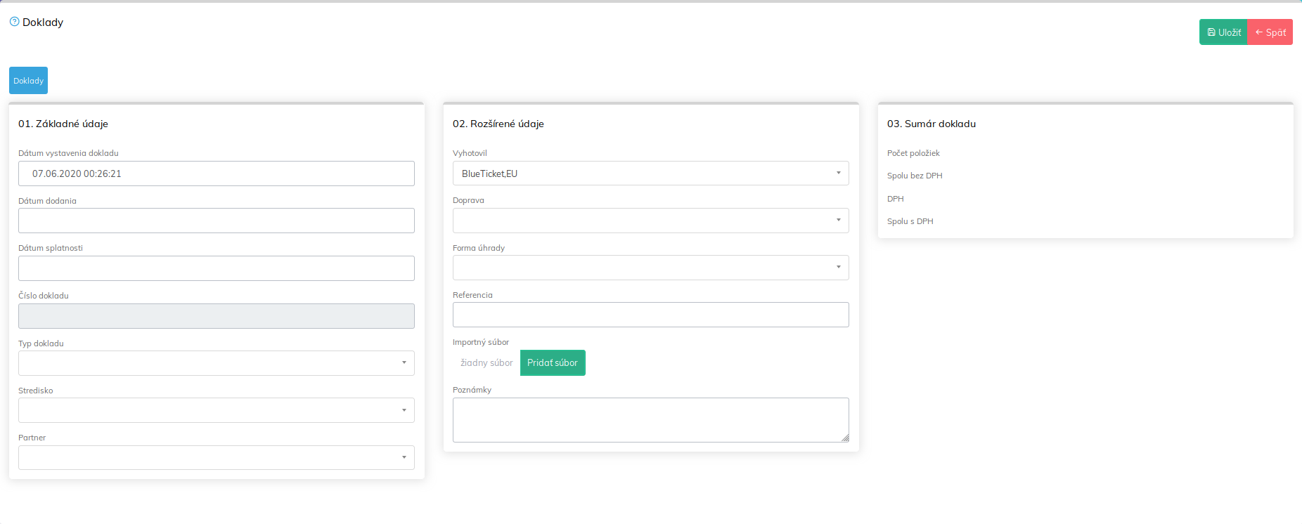 Následne sa otvorí obrazovka pre zadanie základných údajov dokladu.