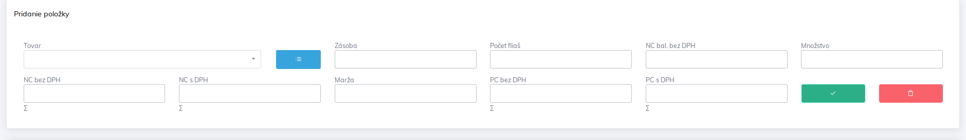 | NC s DPH | Ak poznáte nákupnú cenu za MJ s DPH, zadajte ju sem. NC bez DPH a Marža budú prepočítané automaticky. Údaj pod políčkom označený symbolom ∑ bude prepočítaný na sumu za zadané Množstvo |