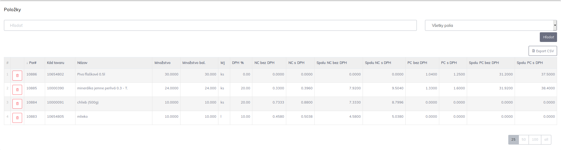 Ak sú údaje zadané do tabuľky správne, stlačte zelené tlačítko, alebo klávesu Enter. Údaje sa prenesú do tabuľky s Položkami, vstupný formulár sa vyčistí a kurzor sa nastaví opäť do poľa pre zadanie ďaľšieho tovaru. Doklad je po pridaní každej položky automaticky uložený, nie je potrebné ho nijak ďalej ukladať. Výhodou je, že aj rozpracovaný doklad napríklad pri výpadku napájania ostáva v poslednom stave a o žiadne dáta neprídete. Jednotlivé položky dokladu vidíte a viete vyhľadávať, prípadne zoraďovať v tabuľke Položky.