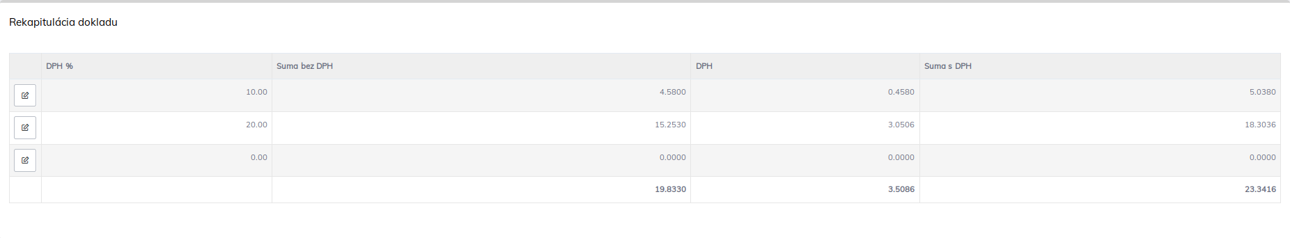 Na konci dokladu sa nachádza rekapitulácia za celý doklad a rozpis dokladu v daňových hladinách. Tieto riadky je možné kvôli zaokrúhľovaniu upravovať.