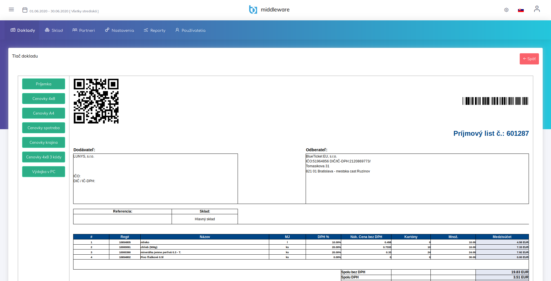 Následne sa otvorí obrazovka s náhľadom na doklad a tlačítka s jednotlivými tlačovými zostavami, ktoré je možné z daného typu dokladu vytlačiť
